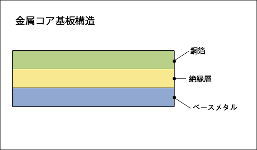 金属ベース基板は金属板をベースにした基板で、金属コア基板は金属板をコアにした基板です。金属ベース基板(注1)で最も一般的に使われる金属は、アルミ、銅とステンレスです。アルミベースの基板は、良好な熱伝導性と放熱性がありかつ低価格で、費用対効果が最も優れています。銅ベースの基板は、アルミに較べ熱伝導性は優れていますが価格は高くなります。ステンレスベースの基板は、熱伝導率は低いのですが、硬さでは先の2つの金属より優れています。金属基板は、熱伝導性に優れていることが知られています。