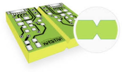 この手法に寸法の異なるプリント基板により適しています。2枚の基板の端に、ミシン目のような小さな穴がたくさん開いているので、折れやすくなっています。