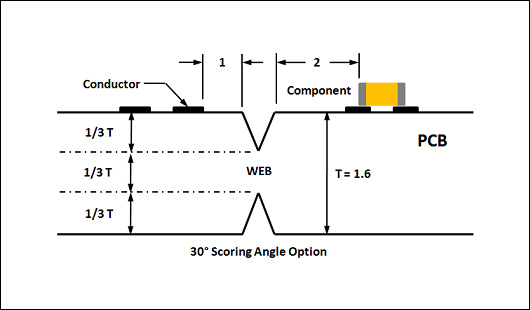 Vカットマシンでカットした隣接した基板の間にはV字溝があり、簡単に折ることが出来ます。VカットはV時溝が基板全体に施されるため、基板端面が真っ直ぐな基板に適しています。