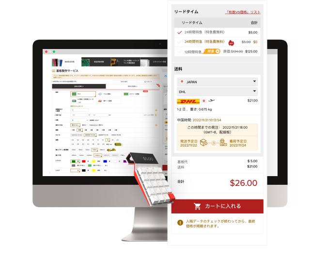 見積書のページでリアルタイムのオンライン計算機を提供しており、カスタムされたPCBプロトタイプの見積書を、数秒で独自に作成することができます。 他の既定のオプションを使用してサイズと数量を入力し、「計算」をクリックするだけで、推定コストが表示されます。材料、サイズ、数量、厚さ、ソルダ―マスクなどのパラメータ、色、表面仕上げ、出荷方法を変更するのに応じて価格が変わります。 目に見えないコストはなく自動的に計算されるため、プロジェクトのコストをブラウザから直接知ることができます。