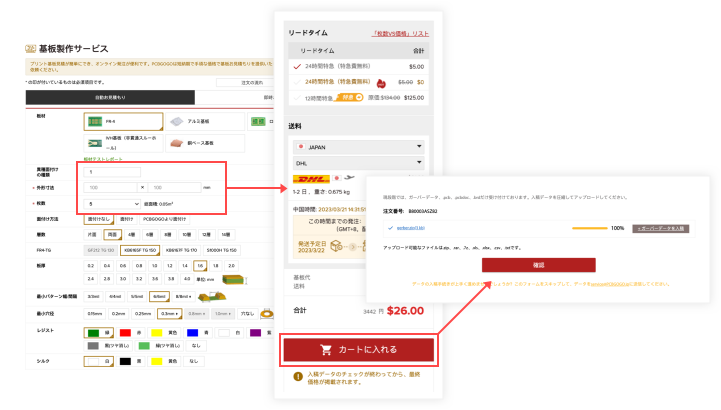 「基板自動見積もり」ページで、ご希望の製作仕様を選択・入力してください。 次に「今すぐ見積もり」をクリックすると、即座に見積もり価格が表示されます。概算価格はほぼ正確です。 ※穴径0.2〜0.3mm、パターン幅/間隔が4〜6mil、面付け対応などの特殊仕様がある場合は、データ確認後に価格が変更される可能性があります。 その後、「カートに入れる」をクリックし、ガーバーデータをアップロードして注文を進めてください。
