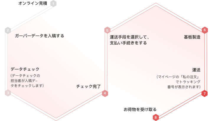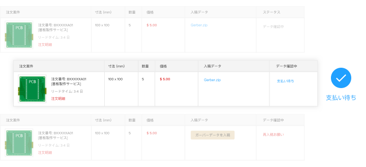 基板の製造作業はご入金を受け取った時点から始まります。基板製造の進捗はオンラインで確認できます。